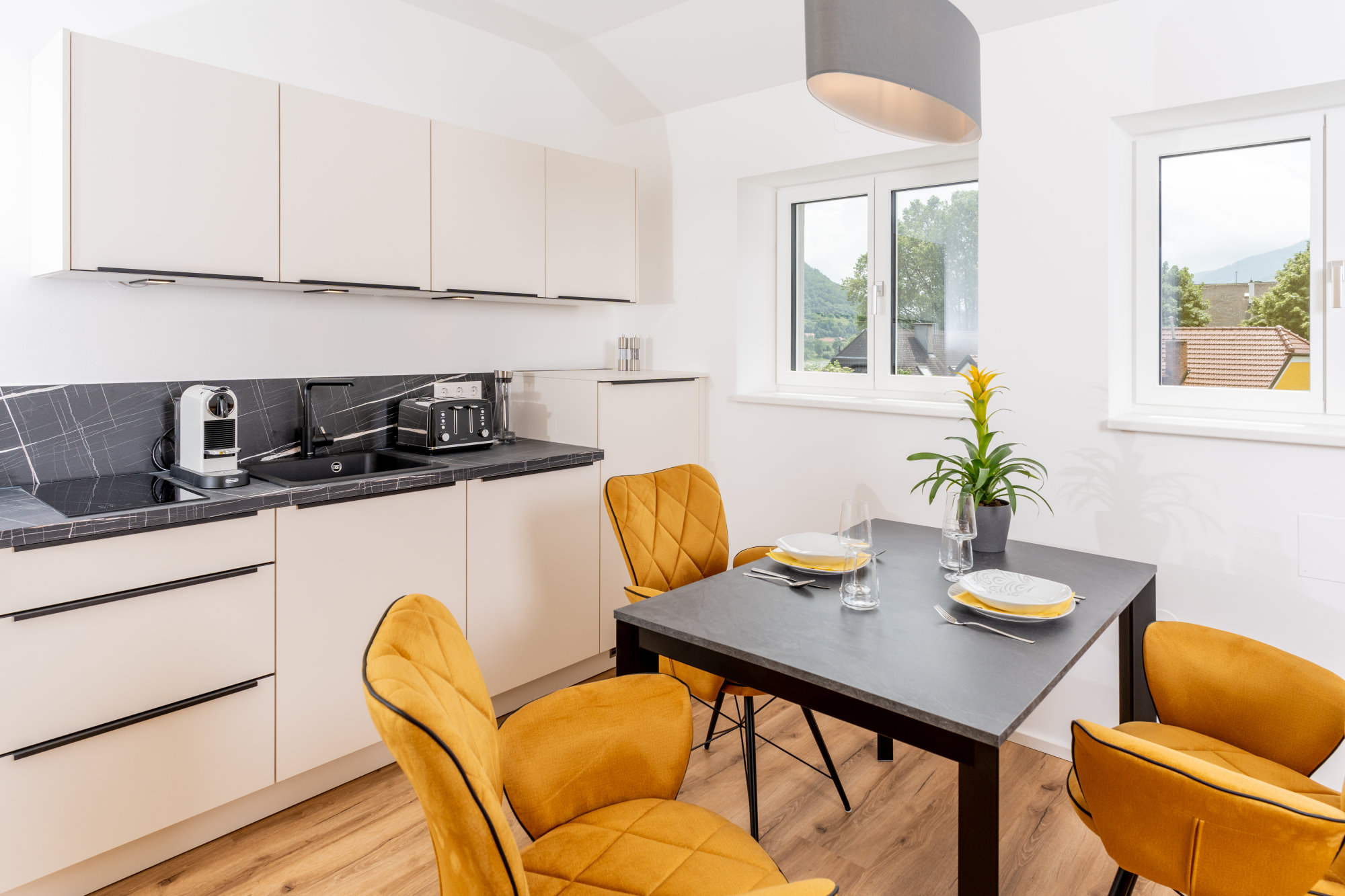 • Küchen sind ausgestattet und mit Geschirr bestückt